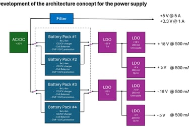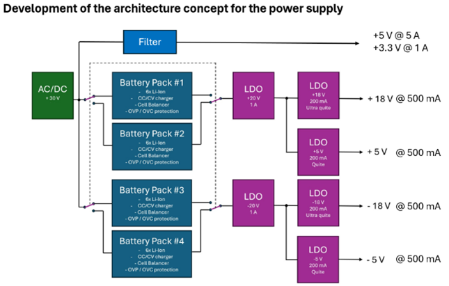 Three potential architectures for an ultra-quiet, low-noise power supply were evaluated, with a battery-operated design featuring automatic switchover selected as the preferred solution for continuous operation.